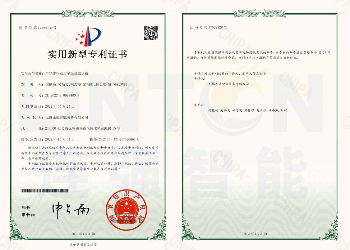 Patent Certificate - Multi-Stage Filter Tank for the Semiconductor Industry